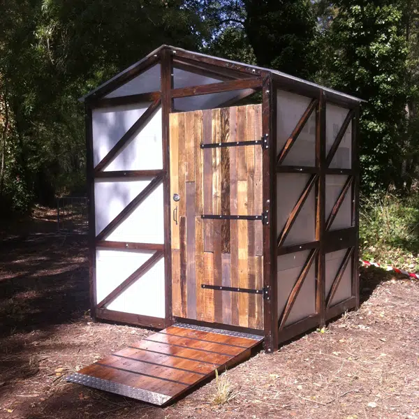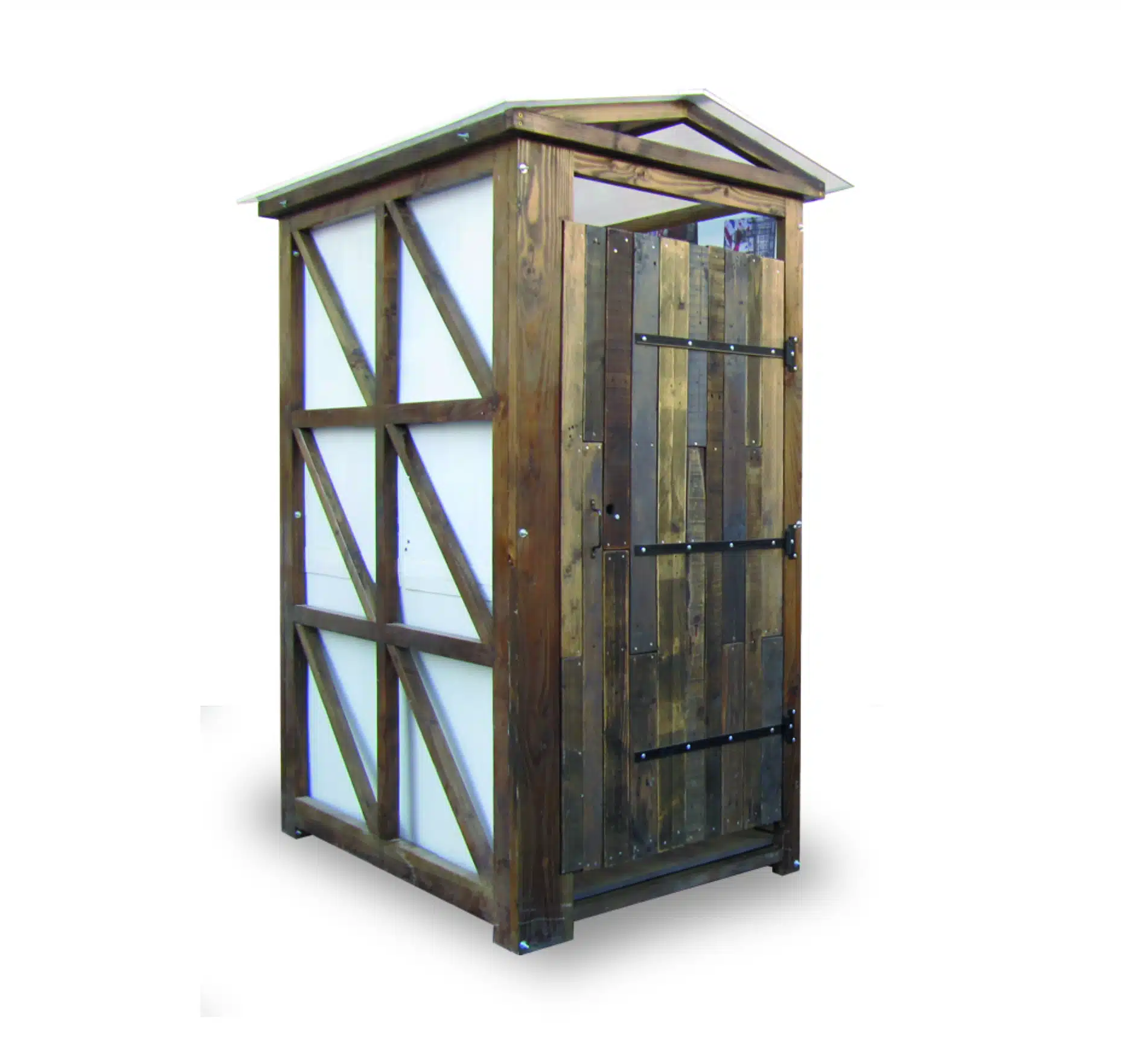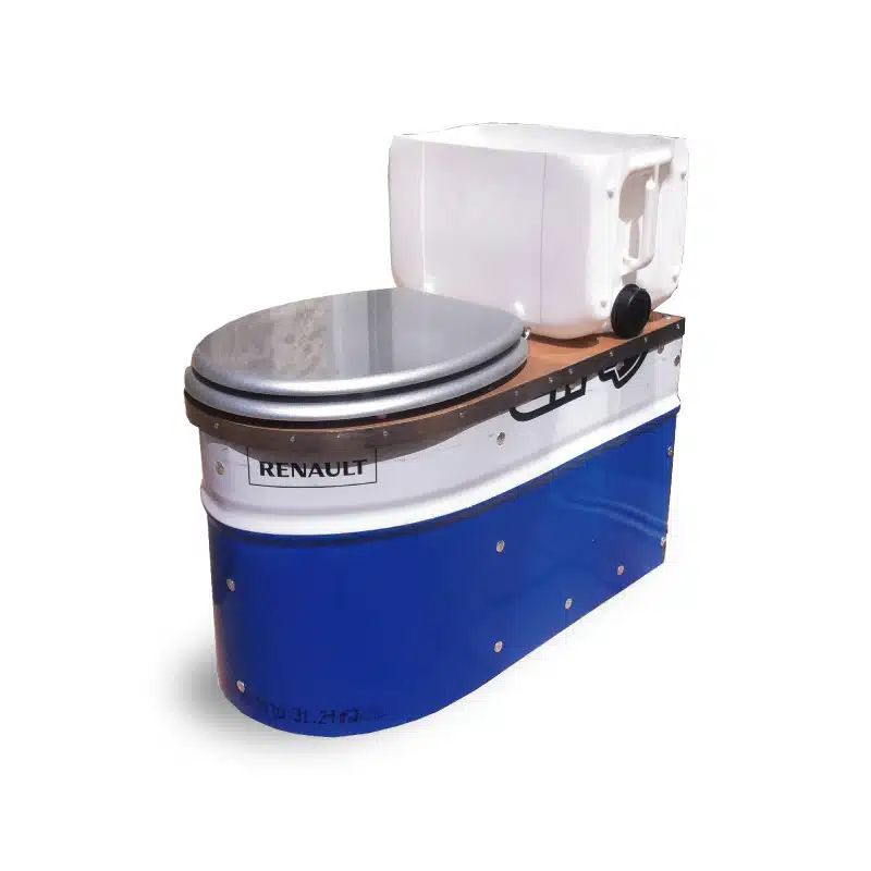 • Des toilettes assis d’aspect visuel proche de toilettes domestiques : sciure dans un contenant ressemblant à une chasse d'eau, lunette classique, …