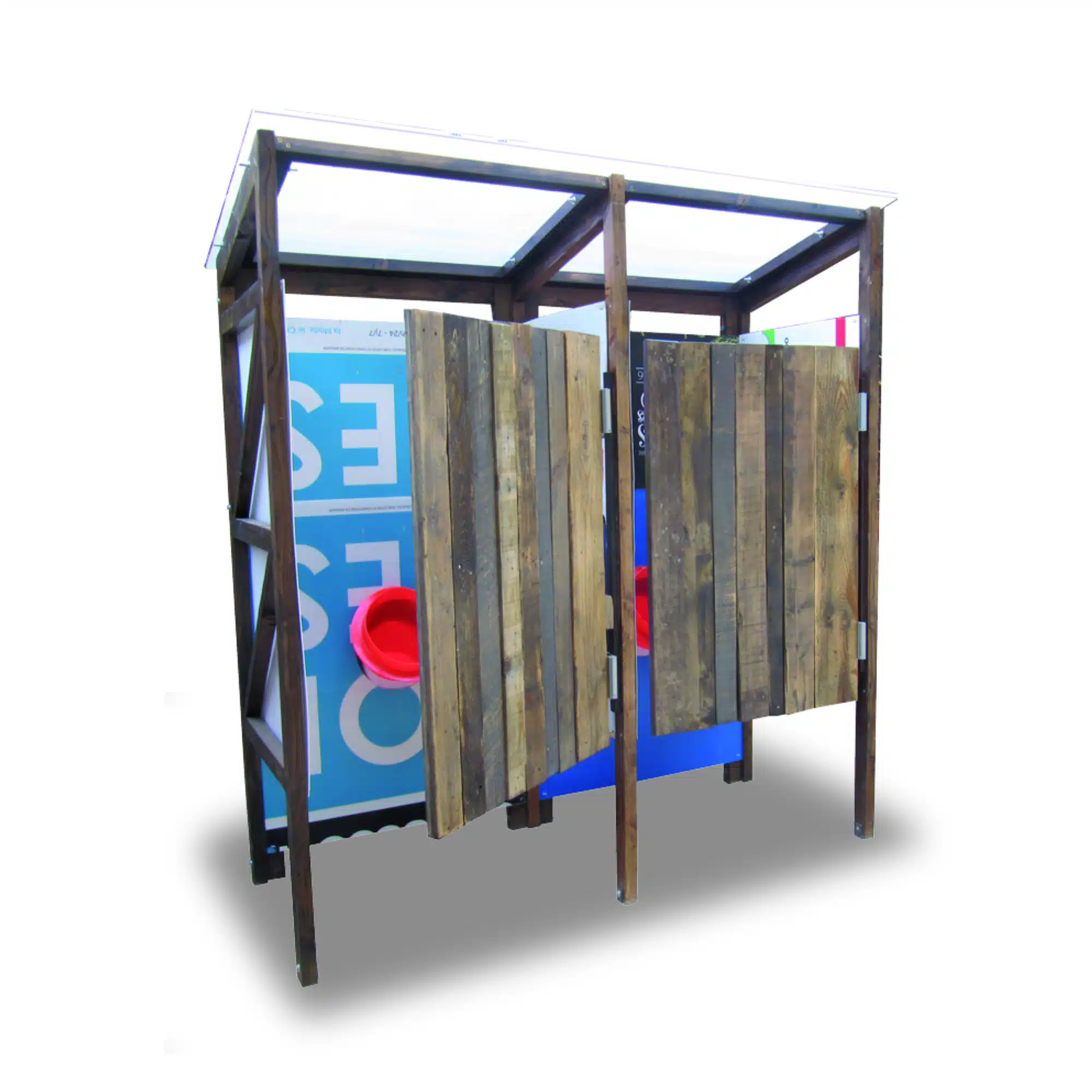 • Des cabines à colombages, avec accessibilité PMR, dont les parois intérieures amovibles sont faites d'anciens panneaux publicitaires