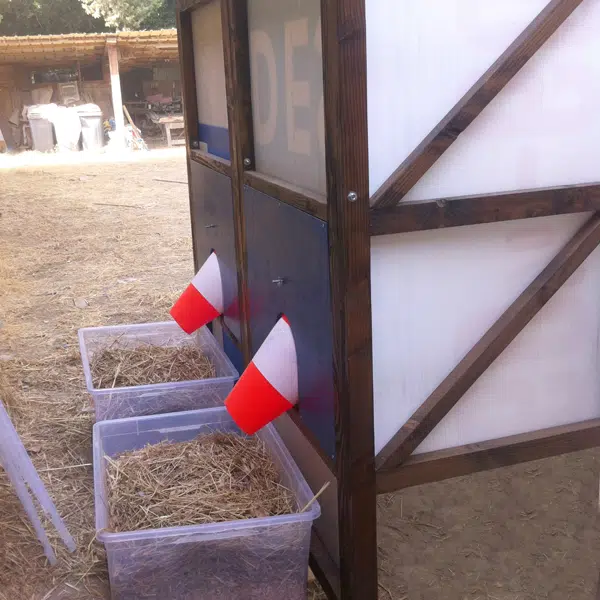 L'ensemble des éléments sont fabriqués à partir de déchets de commerçants et artisans locaux (palettes, fûts métalliques, bidons plastiques, ...) et la quincaillerie amovible est limitée et marquée de codes couleur.